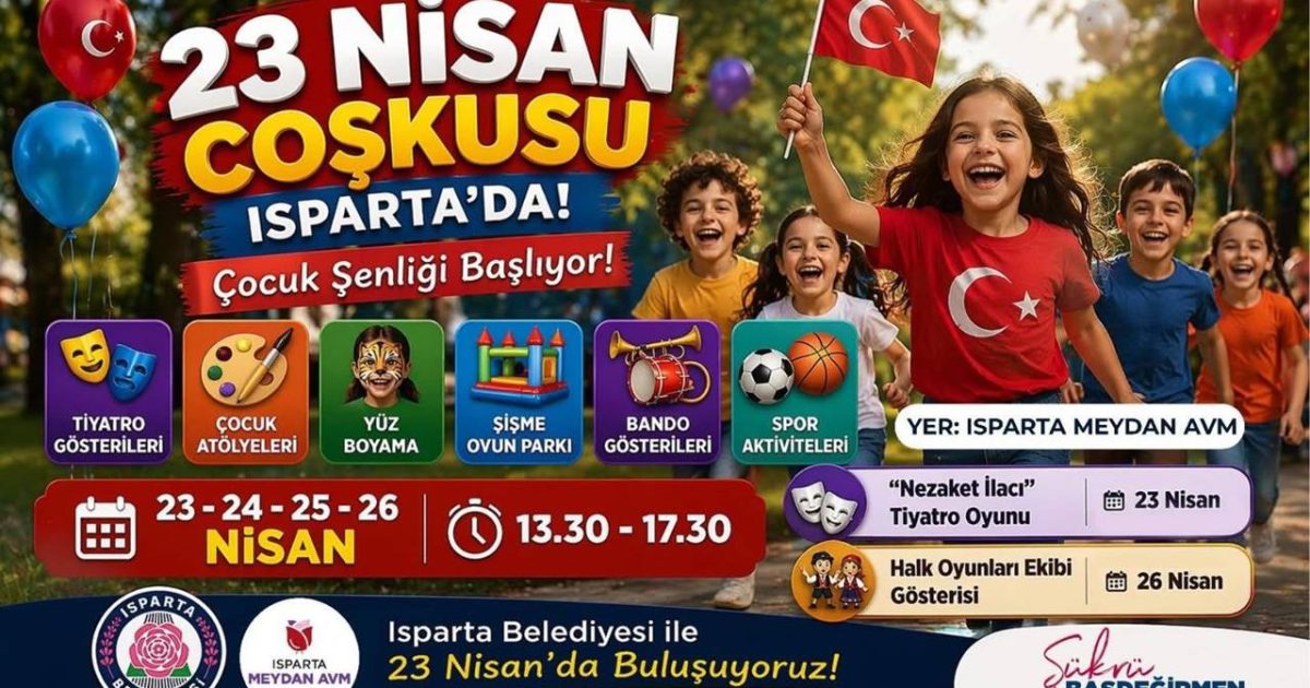 Isparta Belediyesi, 23 Nisan Ulusal Egemenlik ve Çocuk Bayramı’nı Çocuk Şenliği ile kutluyor. Isparta Meydan AVM’de 23-26 Nisan tarihleri arasında gerçekleştirilecek Çocuk Şenliği’nde çocuk atölyelerinden bando gösterisine, spor aktivitelerinden tiyatro gösterisine kadar birçok etkinlik yer alıyor.