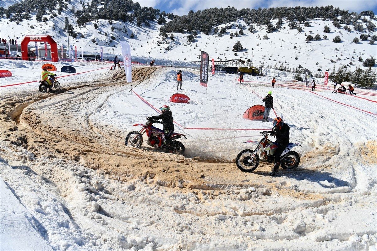 Özel olarak hazırlanan ve kar kalınlığının 1 metreye ulaştığı pistte sporcular motosikletlerinin limitlerini zorladı. Zorlu parkurda ter döken sporcular yarın düzenlenecek yarışmalar öncesinde pisti tanıma fırsatı buldu.