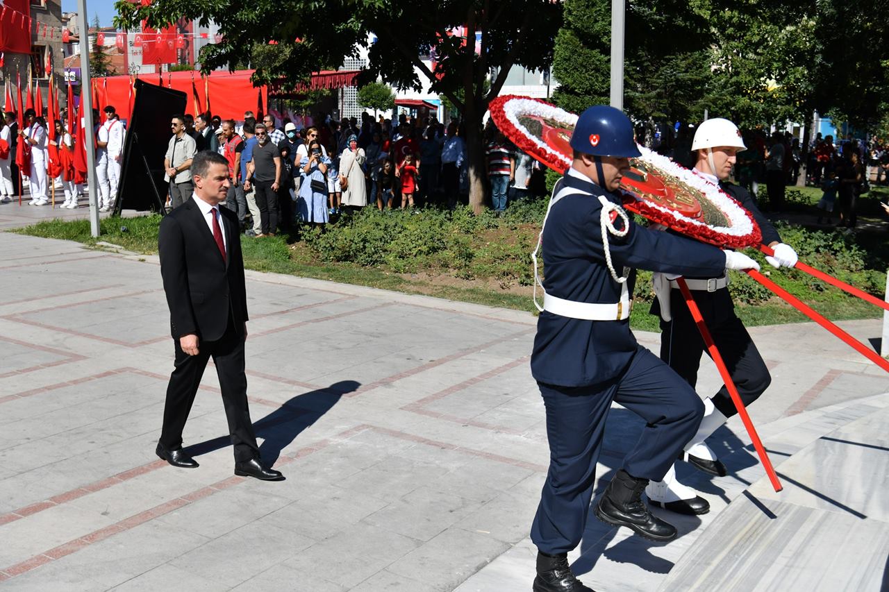 Buradaki program, Vali Baruş, Garnizon Komutanı Kahraman’ın törende bulunanların bayramını kutlaması ve selamlamasıyla başladı. Cumhurbaşkanımız Sayın Recep Tayyip Erdoğan’ın bayram mesajının okunması ve öğrencilerin zafer şiirleri okumasıyla devam eden programda Hızırbey Ortaokulu öğrencileri halk oyunu gösterisi sundu. Ardından Zafer Bayramı dolayısıyla il genelinde okullar arası düzenlenen çeşitli yarışmalarda dereceye girenlere ödül ve madalyaları protokol üyeleri tarafından takdim edildi.