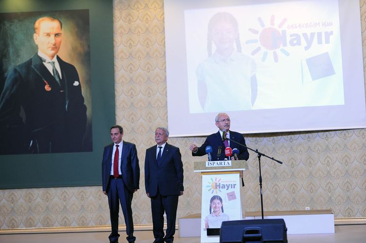 Burdur’daki programlarının ardından Isparta’ya gelen Kılıçdaroğlu, Isparta Esnaf Odası Kongre Merkezi’nde iş adamlarıyla bir araya geldi. Basına kapalı gerçekleştirilen toplantının ardından Süleyman Demirel Kongre Merkezi’nde muhtarlar ve STK temsilcileriyle buluşan Kılıçdaroğlu, burada yaptığı konuşmada, 16 Nisan’da gerçekleştirilecek halk oylamasının, bütün partileri ilgilendirdiğini, bunun için de Türk bayrağı dışında bir bayrak kullanmadıklarını söyledi.