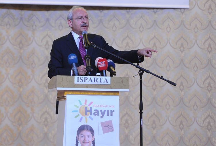 “Mustafa Kemal’in askerleriyiz” sloganlarıyla sık sık konuşması bölünen Kılıçdaroğlu, sandığa gidilerek, onurla şerefle “hayır” oyunun altına mühür basılması gerektiğini belirtti.