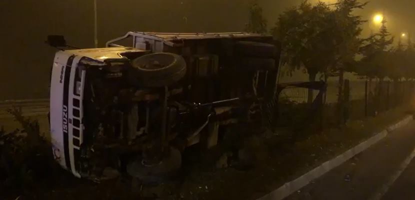 Egzozu kırılan kamyonet yan yattı