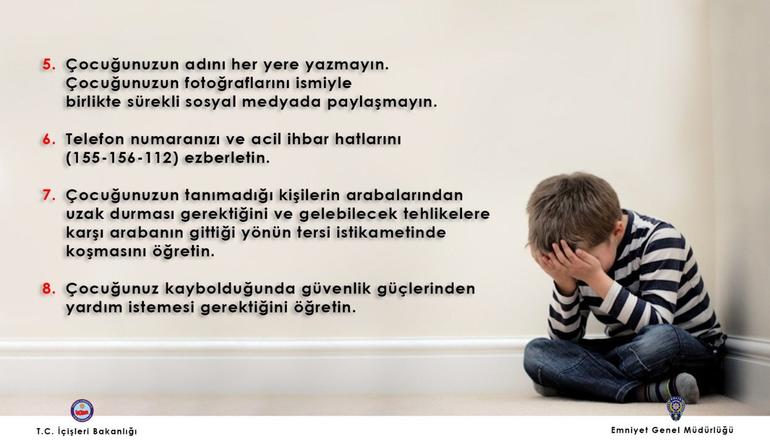 Emniyet Genel Müdürlüğü, resmi sosyal medya hesabından “Anne ve Babalar Dikkat!” uyarısıyla yaptığı açıklamada çocukların kendilerini koruyabilmeleri için yapılması gerekenleri sıraladı.