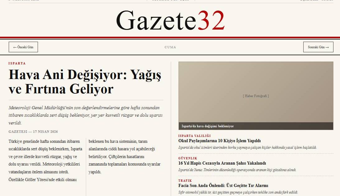 Gazete32 dijital gazetesine gazete32.com.tr/gazete adresinden her gün ulaşabilir, geçmiş tarihlerin baskılarına da gün gezinme butonlarıyla göz atabilirsiniz.