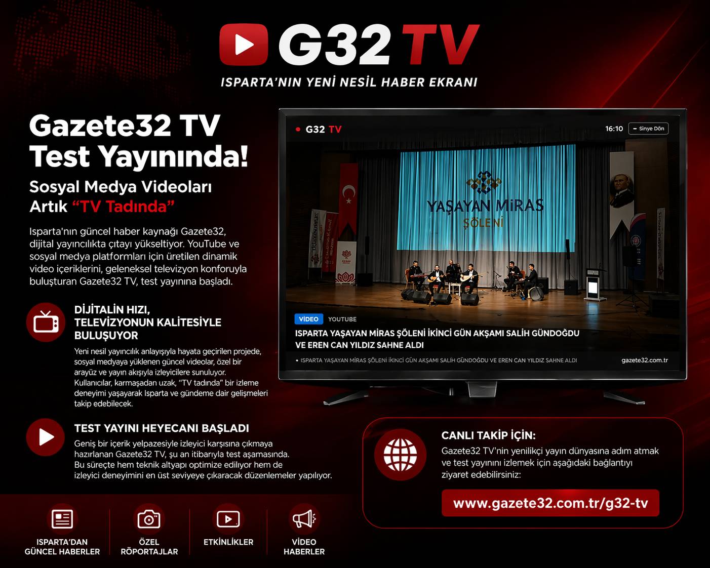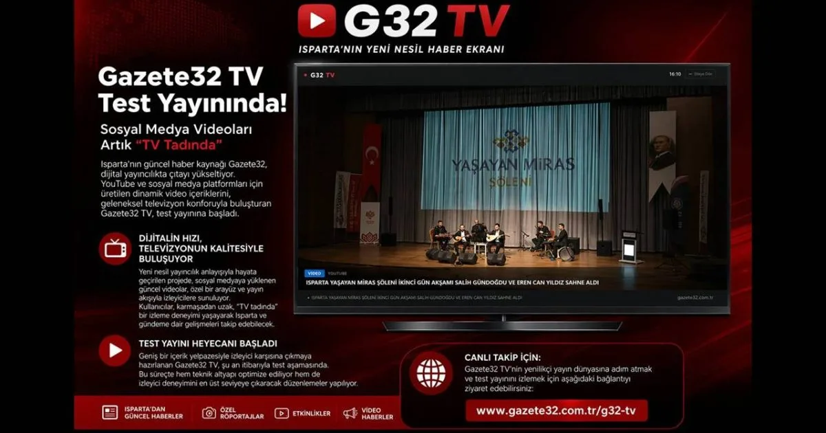 Isparta’nın güncel haber kaynağı Gazete32, dijital yayıncılıkta çıtayı yükseltiyor. YouTube ve sosyal medya platformları için üretilen dinamik video içeriklerini, geleneksel televizyon konforuyla buluşturan Gazete32 TV, test yayınına başladı.