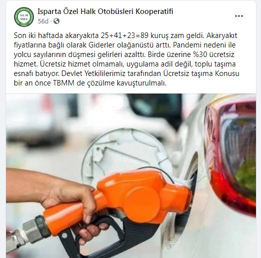 Yapılan paylaşımda; “Son iki haftada akaryakıta 25+41+23=89 kuruş zam geldi. Akaryakıt fiyatlarına bağlı olarak Giderler olağanüstü arttı. Pandemi nedeni ile yolcu sayılarının düşmesi gelirleri azalttı. Birde üzerine %30 ücretsiz hizmet. Ücretsiz hizmet olmamalı, uygulama adil değil, toplu taşıma esnafı batıyor.