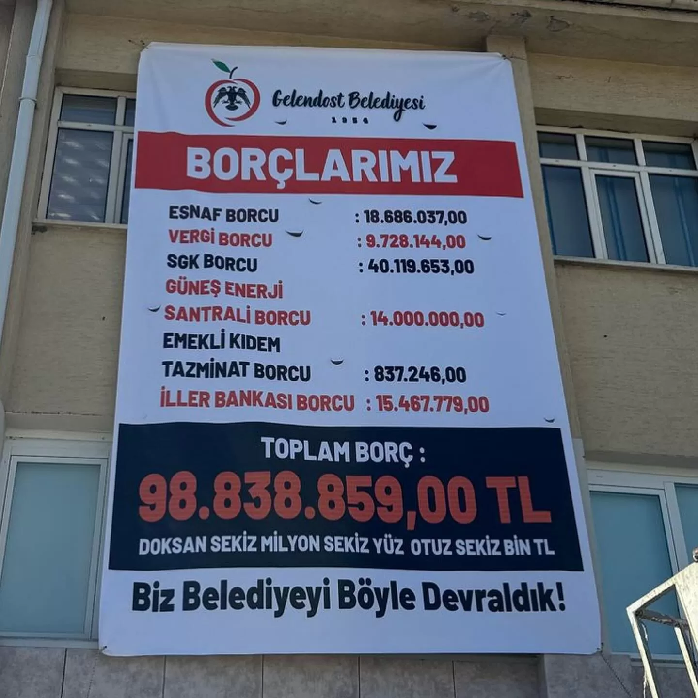 Gelendost belediye binasına asılan dev pankarta, esnaf borcu, vergi borcu, SGK borcu, Güneş enerjisi santrali borcu, emekli kıdem tazminatı borcu, iller bankası borcu yer aldı.