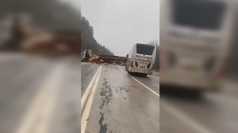 Isparta-Antalya karayolunda yağışlı havanın da etkisiyle kayganlaşan yolda devrilen tır yolun kısmen kapanmasına neden oldu. Devrilen tırın dorsesi daha sonra çekici yardımıyla yoldan kaldırıldı.