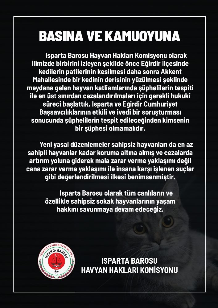 “Isparta Barosu Hayvan Hakları Komisyonu olarak ilimizde birbirini izleyen şekilde önce Eğirdir ilçesinde kedilerin patilerinin kesilmesi daha sonra Akkent Mahallesi’nde bir kedinin derisinin yüzülmesi şeklinde meydana gelen hayvan katliamlarında şüphelilerin tespiti ile en üst sınırdan cezalandırılmaları için gerekli hukuki süreci başlattık. Isparta ve Eğirdir Cumhuriyet Başsavcılıklarının etkili ve ivedi soruşturması sonucunda şüphelilerin tespit edileceğinden kimsenin şüphesi olmamalıdır. Yeni yasal düzenlemeler sahipsiz hayvanları da en az sahipli hayvanlar kadar koruma altına almış ve cezalarda artırım yoluna giderek mala zarar verme yaklaşımı değil cana zarar verme yaklaşımı ile insana karşı işlenen suçlar gibi değerlendirilmesi ilkesi benimsenmiştir. Isparta Barosu olarak tüm canlıların ve özellikle sahipsiz sokak hayvanlarının yaşam hakkını savunmaya devam edeceğiz.”