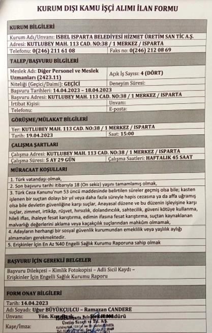 Başvuru yapmak isteyen adaylar, başvurularını 14-18 Nisan tarihleri arasında Isparta Belediyesi Hizmet Üretim San. Tic. A.Ş.’nin Kutlubey Mahallesi, 113 Caddesi No:38/1 adresine yapabilecekler. Başvuruların şirketin insan kaynakları departmanına bizzat teslim edilmesi gerekiyor.