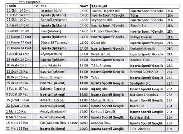 Lig fikstürü de belli oldu. Isparta Sportif Gençlik ilk maçı için kendi olanaklarıyla İstanbul’a gitti. İstanbul Büyükşehir Belediye ile 11 Ekim tarihinde karşılaşacak olan takım kendi sahasındaki ilk maçı da Işıkkent Spor Salonu’nda 18 Ekim tarihinde Tofaş’la yapacak.