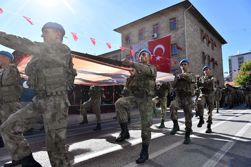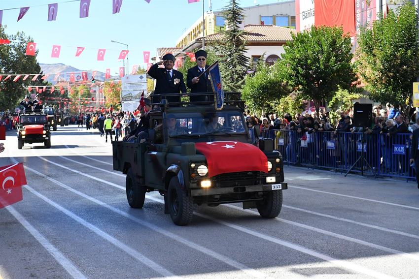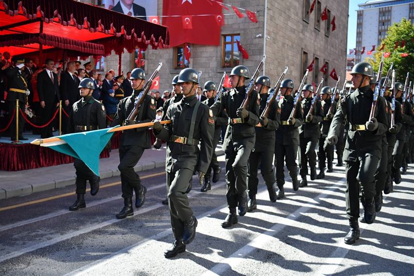 Daha sonra geçit töreni yapıldı. Geçit töreni sırasında Vali Aydın Baruş, Garnizon Komutanı Albay Mustafa Kahraman ve Belediye Başkanı Şükrü Başdeğirmen, törene katılan askerlerimiz, kahraman gazilerimiz ve öğrencileri selamladılar.