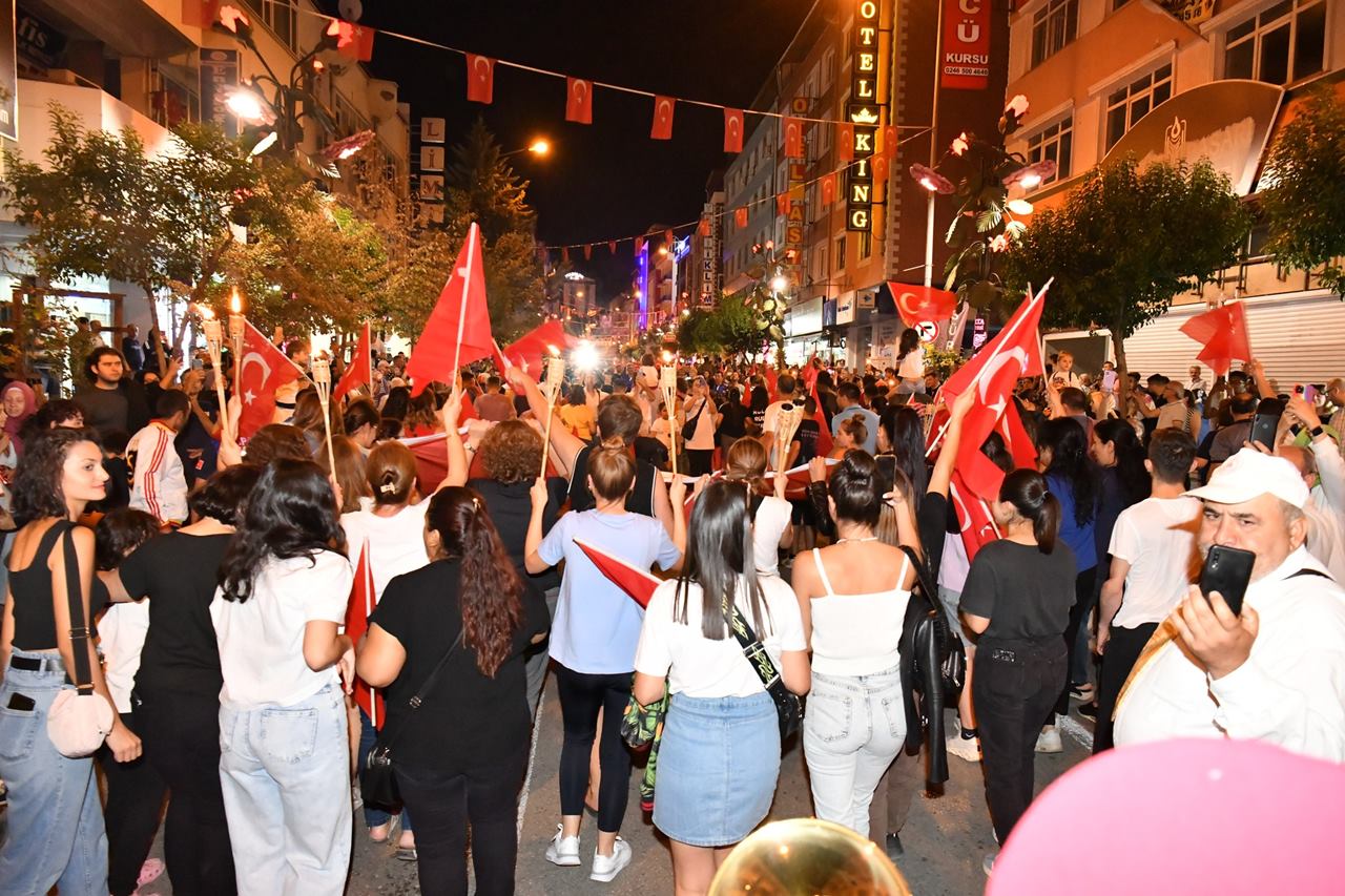 Büyük Zaferin 100’ üncü yıl dönümü gündüz programlarında coşkulu bir şekilde kutlanırken kutlamalar akşam da resepsiyon ve fener alayı ile devam etti.