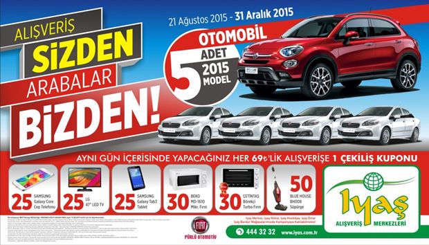 21 Ağustos Cuma günü başlayan geleneksel Iyaş AVM “Alışveriş sizden arabalar bizden” kampanyası ile alışverişlerini Iyaş’tan yapanlar, birbirinden değerli otomobil ve hediyeleri kazanma şansına sahip olacaklar. Büyük kampanya 21 Ağustos-31 Aralık 2015 tarihleri arasında gerçekleştirilecek.