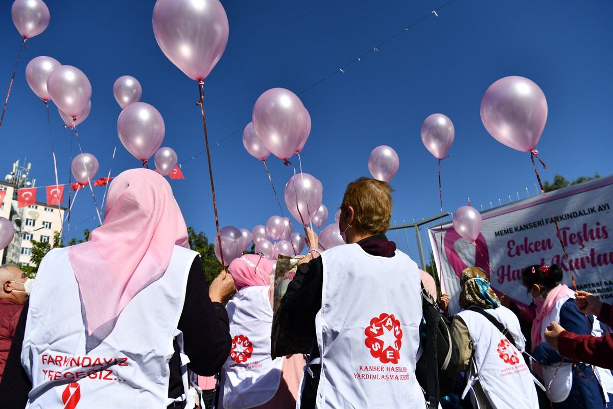 Ardından meme kanserinde erken teşhisin önemini vurgulamak için Vali Seymenoğlu ve katılımcılar gökyüzüne pembe balon bıraktı, hazırlanan tatlıları ziyaretçilere ikram ettiler.