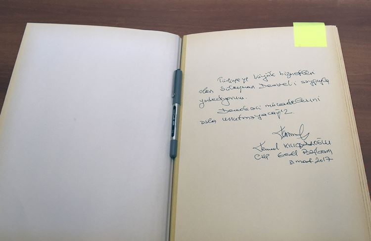 Burada bir süre kalan Kılıçdaroğlu, anı defterine “Türkiye’ye büyük hizmetleri olan Süleyman Demirel’i saygıyla yad ediyoruz. Demokrasi mücadelesini asla unutmayacağız.” yazdı.
