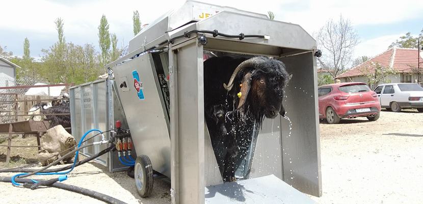 Hayvanların temizliği ve konforu için basınçlı suyun püskürtülmesi ile çalışan bir makine olan küçükbaş hayvan dış parazit ilaçlama makinası, pratik ilaçlama imkanı sağlıyor. Makinenin yıkama platformuna giren hayvanların sensörler tarafından algılanmasının
