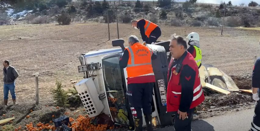 Isparta Eğirdir yolunda seyir halindeyken lastiği patlayan meyve yüklü kamyonet, sürücünün direksiyon hakimiyetini kaybetmesi sonucu şarampole devrildi. Kazada şans eseri ölen yada yaralanan olmazken, olay yerine dağılan meyvelerde büyük zarar meydana geldi.