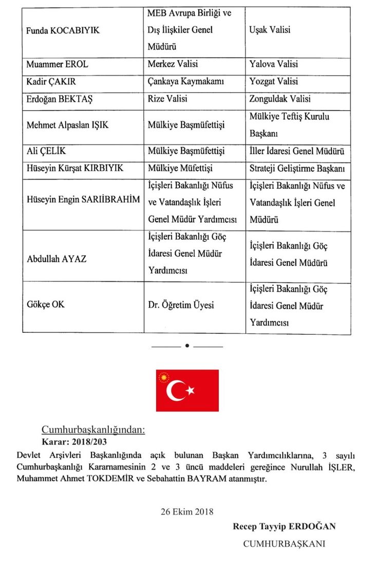 Cumhurbaşkanlığı hükümet sistemine geçilmesinin ardından Cumhurbaşkanı Recep Tayyip Erdoğan tarafından ilk Kez “valiler kararnamesi” yayımlandı. Buna göre 21 ilin valisi görevden alınırken, 39 ile yeni vali atandı. Görevden alınan valiler mülkiye başmüfettişliğine atandı.