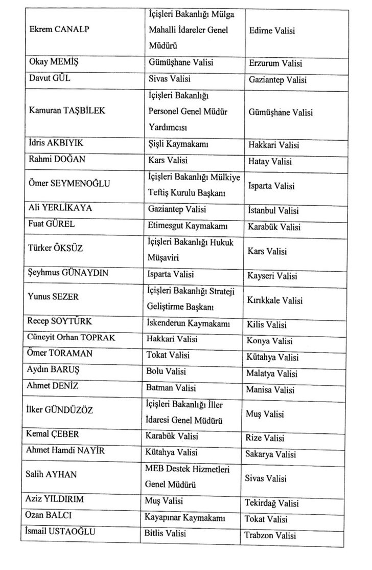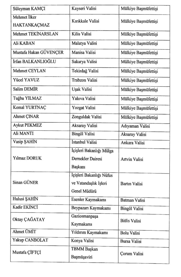 Cumhurbaşkanlığı hükümet sistemine geçilmesinin ardından Cumhurbaşkanı Recep Tayyip Erdoğan tarafından ilk Kez “valiler kararnamesi” yayımlandı. Buna göre 21 ilin valisi görevden alınırken, 39 ile yeni vali atandı. Görevden alınan valiler mülkiye başmüfettişliğine atandı.