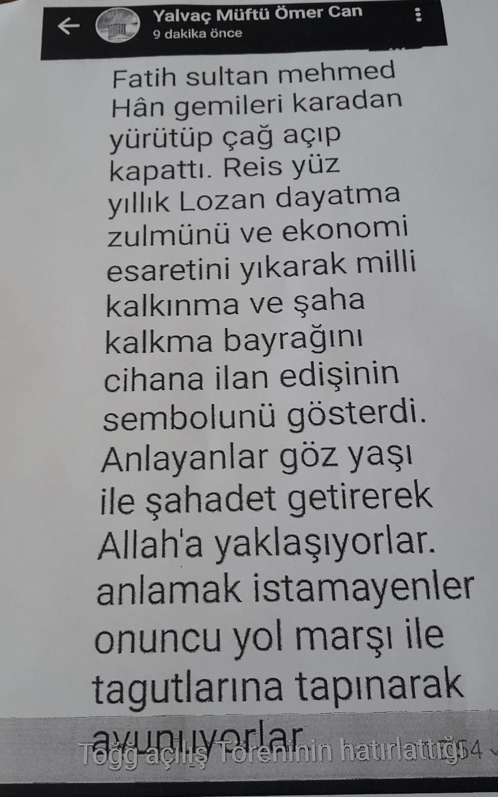 CHP Isparta İl Başkanı Yalım Halıcı, Yalvaç İlçe Müftüsü Ömer Can’ın Whatsapp paylaşımında Atatürk’e hakaret ettiği gerekçesiyle suç duyurusunda bulundu.