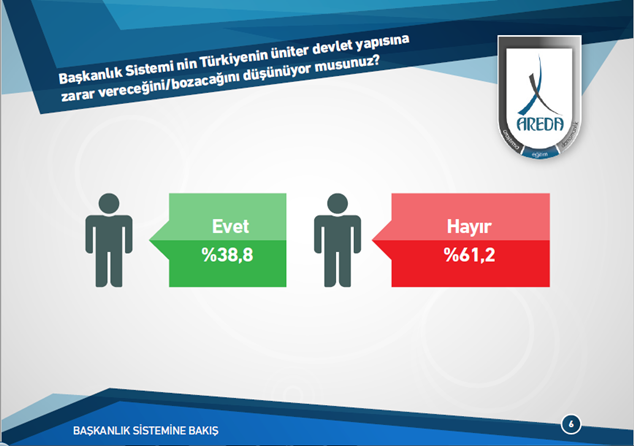 Başkanlık sistemi Türkiye’nin üniter devlet yapısına zarar vereceğini/ bozacağını düşünüyormusunuz sorusuna ise yüzde 61,2 Hayır cevabını vererek endişelere katılmadığını dile getirdi.