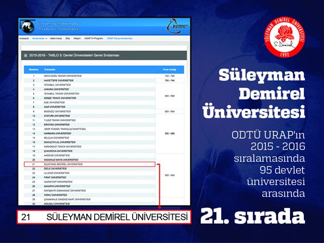 ODTÜ Enformatik Enstitüsü bünyesinde yer alan URAP Araştırma Laboratuvarı, Türkiye’nin en iyi üniversitesi sıralamasını açıkladı. Bu yıl 134 üniversitenin yer aldığı URAP Türkiye sıralamasında 25. sıraya yerleşen Süleyman Demirel Üniversitesi, 95 devlet üniversitesi arasından da 21. sırada yer aldı.