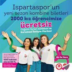 Süleyman Demirel Üniversitesi Spor bilimleri Fakültesi ile Ispartaspor arasında yapılan işbirliği kapsamında SDÜ kız öğrencilerine 2 bin adet ücretsiz kombine bilet dağıtılacak. Ayrıca tüm öğrencilere Ispartaspor maç biletleri, yüzde 50 indirimli satışa sunulacak.