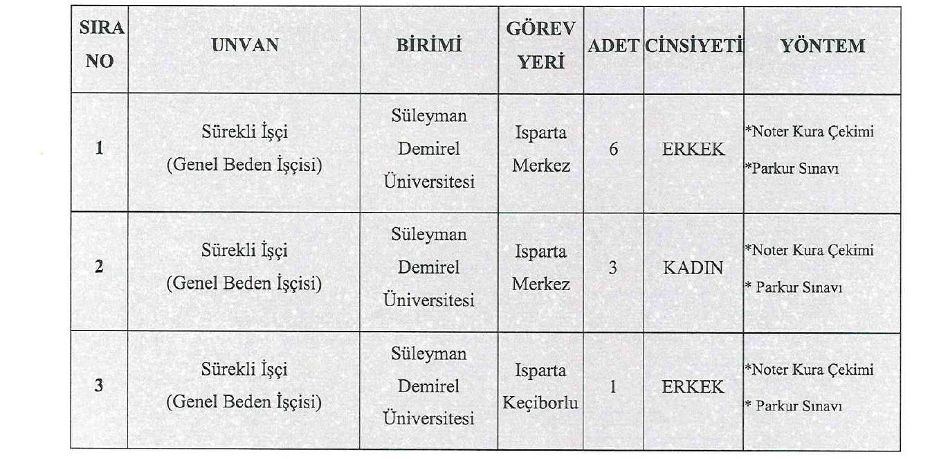 Süleyman Demirel Üniversitesi ve bağlı birimlerinde çalıştırılmak üzere 4857 sayılı İş Kanunu ve Kamu Kurum ve Kuruluşlarında İşçi Alınmasında Uygulanacak Usul ve Esaslar Hakkında Yönetmelik kapsamında Türkiye İş Kurumu (İŞ-KUR) aracılığıyla aşağıda yer alan tabloda dağılımı gösterilen şekilde sürekli işçi alımı yapılacaktır.