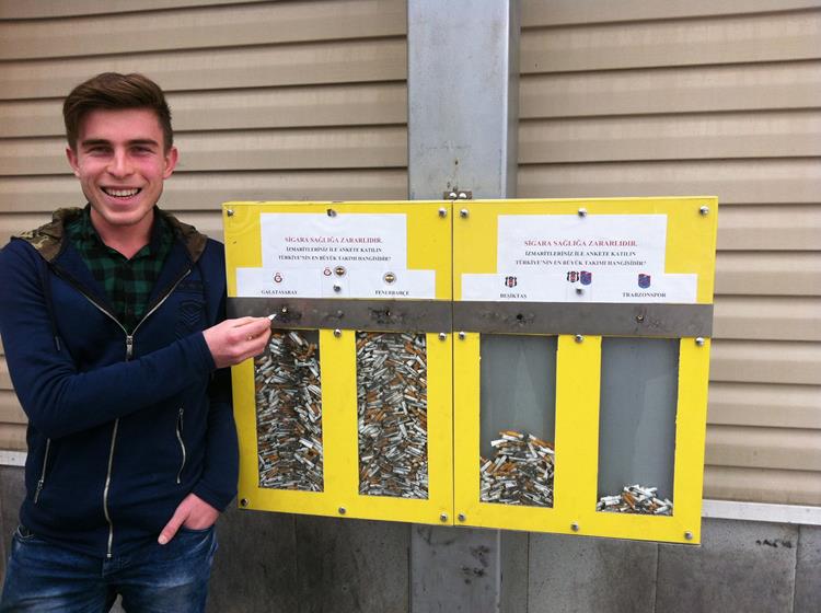 ‘Sigara içen öğrencilerimizin izmaritlerini yerlere atmamaları için, (Türkiye’nin en büyük takımı hangisidir?) sorusuyla bir anket başlattık. Kendi okulumuzda dizayn edip ürettiğimiz, camlı anket kutularına ilgi büyük oldu. Sigara içen pek çok öğrencimiz izmaritlerini yere atmak yerine takımlarına destek vermek için, anket kutularına atmaya başladılar. Hatta sigara içmeyen öğrencilerimizin, yerlerdeki izmaritleri toplayarak, takımlarını öne geçirmek için kutulara attıklarına şahit olduk. Bizim amacımız temel olarak sigara içilmesine mani olmak. Ancak hem bunu yapmayıp hem de çevreyi kirleten öğrencilerimizi bu yöntemle alıkoymaya çalışıyoruz. Ankette ise Fenerbahçe ilk, Galatasaray ikinci, Beşiktaş üçüncü, Trabzonspor ise son sırada yer alıyor.’