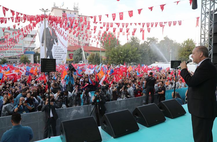 Cumhurbaşkanı Erdoğan, sözlerini şöyle sürdürdü: “Türkiye’nin geleceğinde terör örgütlerine ve bu örgütlere kapı kulluğu yapan hiç kimseye yer yoktur. Bölücü örgütün belediye başkanı tayin etmesine de, belediye imkânlarının şehir eşkıyalarına peşkeş çekilmesine de asla tahammülümüz olamaz. Ülkemizin 81 vilayetinde hizmet için, kalkınma için, yol, köprü, okul yapılması için devlete ödenen vergilerin çukurlara gömülmesine, dağlara saçılmasına müsaade etmeyeceğiz.”