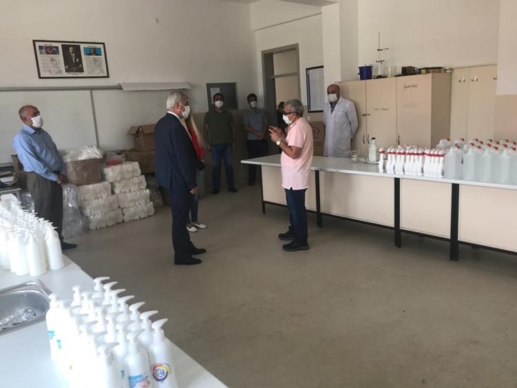 Önümüzdeki günlerde yapılacak olan Liselere Giriş Sınavında (LGS) salonlarda ürettikleri el dezenfektanları kullanılacak olan okulda incelemelerde bulunan Vali Ömer Seymenoğlu okul yöneticisi ve öğretmenlerinden yürütülen çalışmalar hakkında bilgi aldı. Okulun araştırma geliştirme çalışmalarını yaptığı; kene ile mücadelede bor ve doğal yağ katkılı ürün çalışması, ozon-uvc (ultraviyole) dezenfektan çalışması ve doğal yağlardan üretilen oda spreyi çalışması hakkında da bilgiler alan Vali Seymenoğlu öğretmen ve öğrencileri tebrik ederek başarılar diledi.