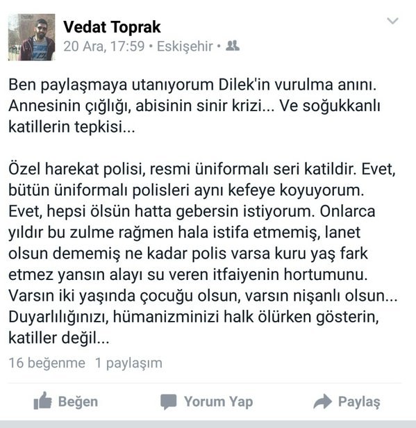 Toprak, paylaşımında, “Ben paylaşmaya utanıyorum Dilek’in vurulma anını. Annesinin çığlığı, abisinin sinir krizi… Ve soğukkanlı katillerin tepkisi… Özel harekat polisi, resmi üniformalı seri katildir. Evet, bütün üniformalı polisleri aynı kefeye koyuyorum. Evet, hepsi ölsün hatta gebersin istiyorum. Onlarca yıldır bu zulme rağmen hala istifa etmemiş, lanet olsun dememiş ne kadar polis varsa kuru yaş fark etmez yansın alayı su veren itfaiyenin hortumunu. Varsın iki yaşında çocuğu olsun, varsın nişanlı olsun… Duyarlılığınızı, hümanizminizi halk ölürken gösterin, katiller değil…” ifadelerini kullanmıştı.
