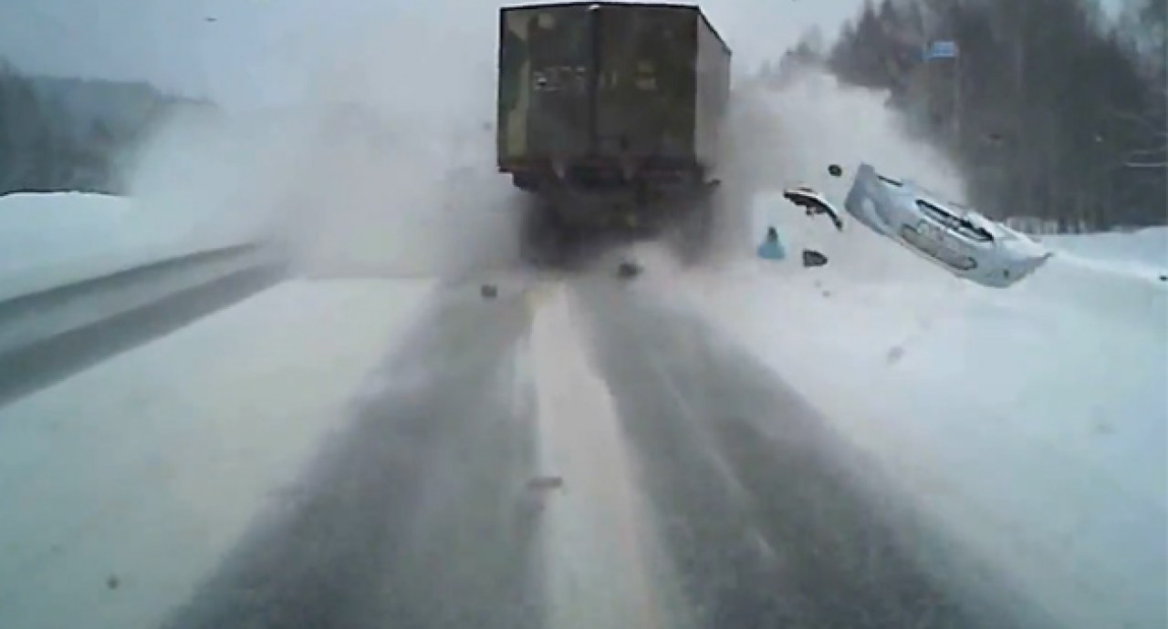 Rusya’da kar yağışı dolayısıyla buzlanan zeminde kontrolü yitirilen otomobil, karşı şeride geçti ve kamyonla çarpıştı.