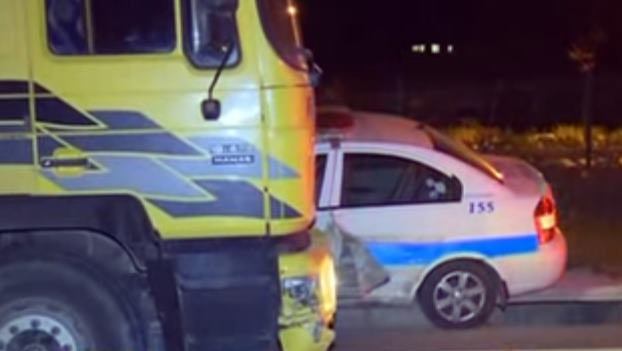 Migros Kavşağında iş makinesi taşıyan tır ile polis aracı çarpıştı. Çarpışmanın etkisiyle tır polis aracını metrelerce sürükledi.