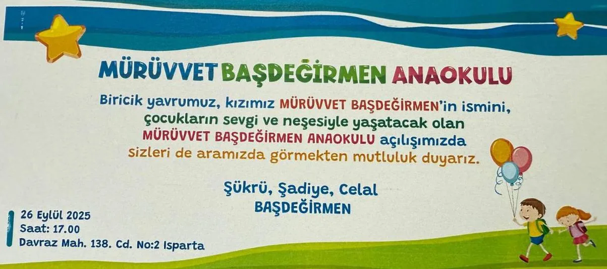13 Mayıs 2023’te aramızdan ayrılan, Şükrü ve Şadiye çiftinin biricik kızları, Celal Başdeğirmen’ in kardeşi Öğretmen Mürüvvet Başdeğirmen’ in adını yaşatacak MÜRÜVVET BAŞDEĞİRMEN ANAOKULU 26 Eylül 2025 Cuma günü saat 17: 00 da dualarla açılışı yapılacak. Ülkemize hayırlı evlatların yetiştirilmesi umutlarımızla hayırlı olsun!